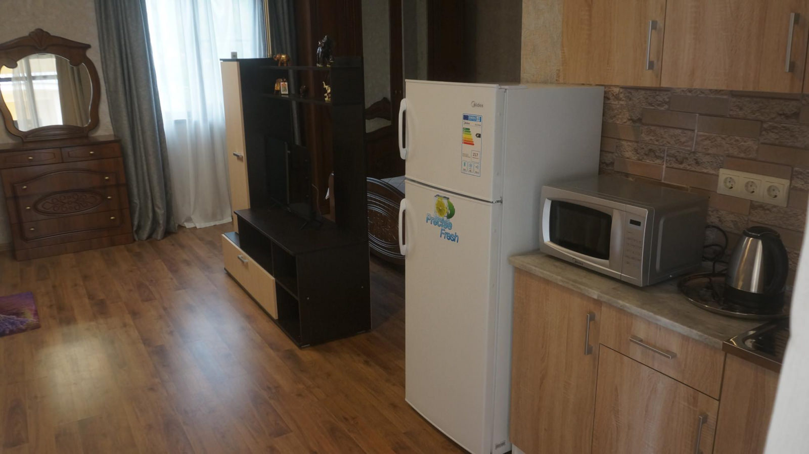 Номер с раздельными зонами спальни и гостиной. Возможно проживание 4-х гостей. В спальной зоне находится большая двуспальная кровать, в гостиной раскладывающийся диван. В номере холодильник, мини-кухня, телевизор с цифровым телевидением, столовые приборы, собственная ванная комната, шкафы под одежду, обеденный стол, стулья.